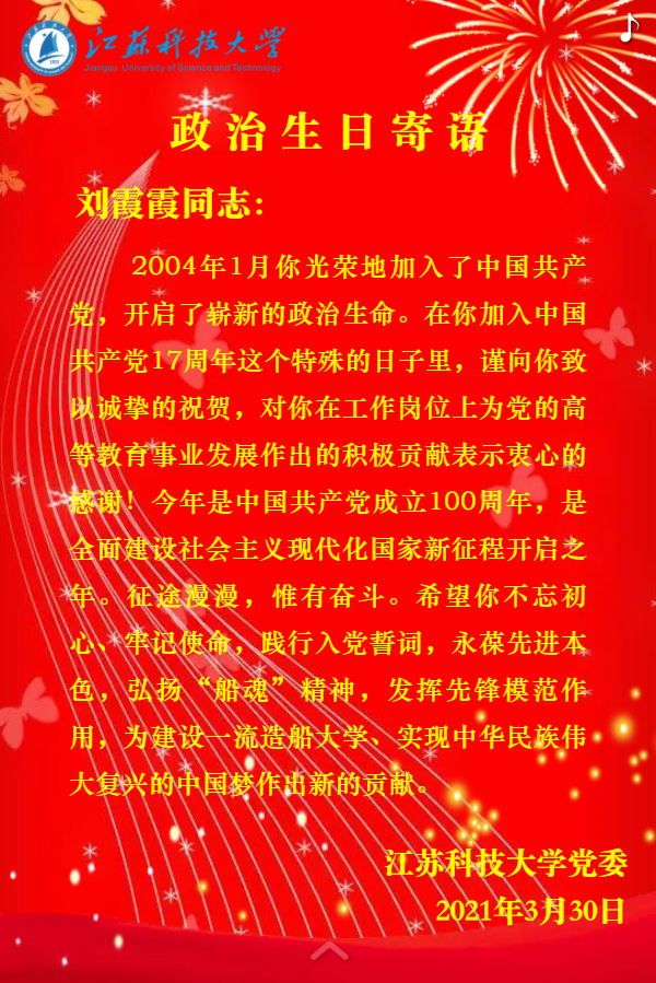 “政治生日贺卡”字字千钧,搭建了党组织与党员之间的“连心桥”。基建处支部刘霞霞说:“衷心感谢党组织多年来对我的培养和关爱,今后我将继续不忘初心、牢记使命,继承和发扬党的优良传统,对党忠诚、爱岗敬业,永葆党员本色。”深蓝学院第二支部杜伟伟说:“很意外很美好,感受到了党组织家的温暖问候。在快要不记得自己党龄的时候,及时提醒了我们要回首入党初心、重温入党誓词、不忘教育使命,带着组织赋予的力量继续前行。”国资处支部方倩在微信朋友圈晒出自己政治生日贺卡。党员同志表示,要进一步提振精气神、凝聚正能量,以更加坚定的信念、更加高昂的斗志、更加过硬的作风,全力以赴投入到工作之中。