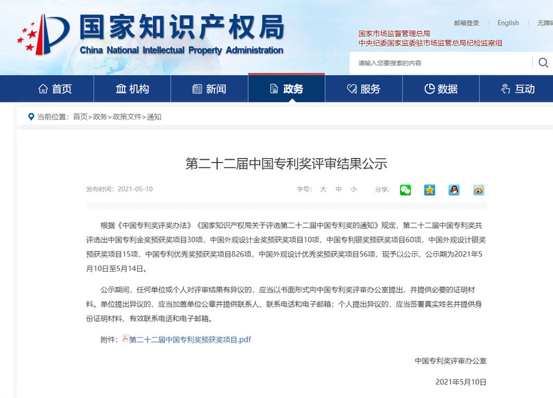 据悉,中国专利奖于1989年设立,与国家科技奖齐名,由联合国世界知识产权组织和国家知识产权局共同颁奖,是中国唯一对获授专利权的发明创造给予奖励的政府部门奖,是我国知识产权领域最高奖项。