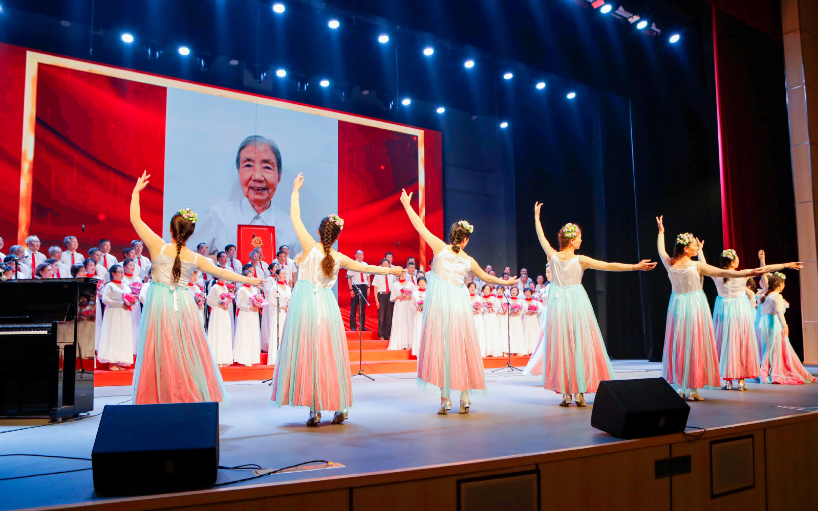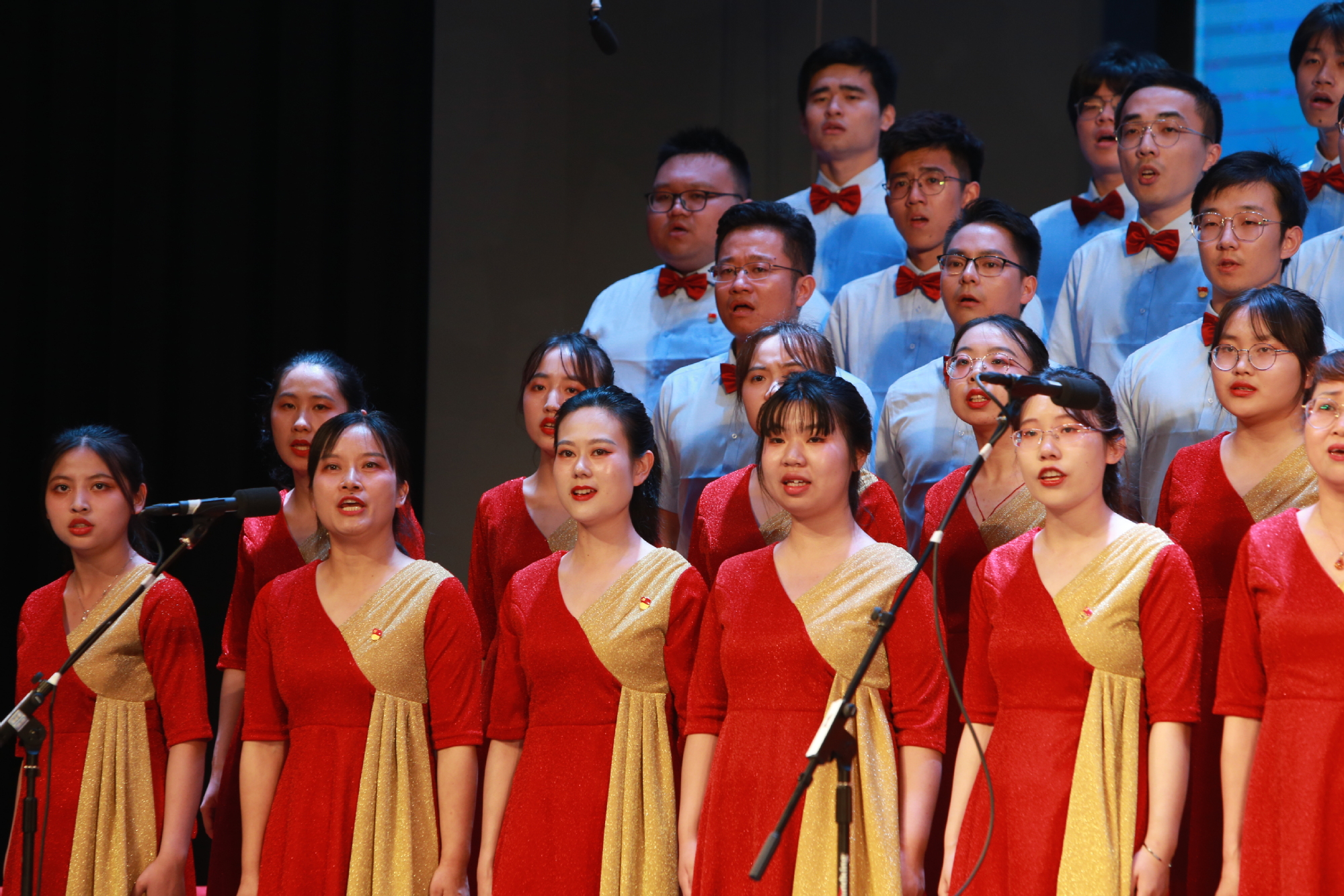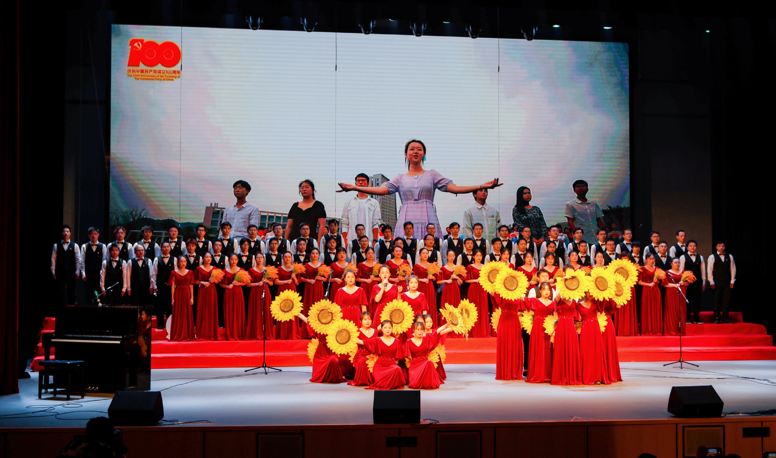 “在希望的田野上”“壮丽航程”“不忘初心”“我宣誓”……一首首好歌唱响校园余音绕梁。舞台上,情景演唱、多重合唱、歌舞串烧、击鼓踏歌、领唱领诵、钢琴伴奏,艺术形式交相映衬相得益彰,动人的旋律、经典的唱词、激越的情绪烘托出磅礴意境,引人深深感怀一百年岁月峥嵘,一百年奋斗不息,动情回望中国共产党带领中华儿女经过艰苦卓绝的斗争和奋斗,从容写下全国各族人民富裕、兴旺和幸福的壮丽篇章,礼赞开创百年波澜壮阔的伟大征程。