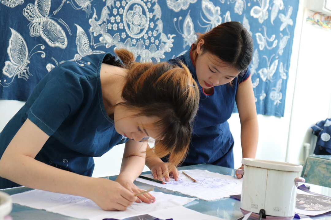 图为苗族蜡染传承人龙鹿老师教实践团成员上蜡。
