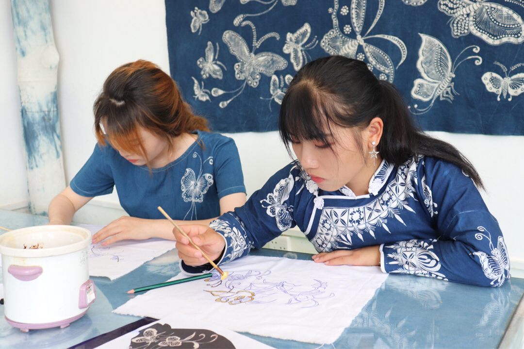 31日下午,实践团队继续走访了当地蜡染工厂和周边村落,实践团队了解到蜡染工厂的建立是脱贫攻坚、乡村振兴的产物,政府的扶持和助力也加快了当地脱贫致富的步伐。闲谈之余,一位70多岁的蜡娘笑着说:“很感谢有了政府的帮助和支持,大家不仅从偏僻山区走了出来,还能在这里安心的做蜡染,既没有把自己的老本本丢掉,还能把自己的技艺继续传给下一代人;在做自己的蜡染时,还为自己带来了收入,每年都能有很不错的收入,这样的方式真正的帮助大家实现了脱贫致富。”在走访观察蜡染工厂时 ,杨而报浪老师说自己没有读过太多书,但是自己从小跟着长辈学习蜡染,仅仅用了三年的时间就学成。恰逢国家出台相关政策保护苗族蜡染时,越来越多的人开始关注并喜欢上了蜡染。于是在机缘巧合之下,杨而报浪老师遇到了刚从外地返乡正准备在家乡创业的王方舟老师,于是两人便合伙经营了这家千年传蜡染工厂。而当时的易地扶贫搬迁工作不仅为苗族蜡染艺术品出售到更远的地方提供了良好的环境,同时也大大解决了易地扶贫搬迁带来的人员就业问题。他们还在万达小镇里面创建了“欧报浪蜡染体验馆”。很多来万达小镇旅游的游客都会来体验馆里体验做蜡染的乐趣,它也成为了许多高校学生的写生、研学基地。在走访过程中实践团成员了解到:蜡染技术的发展与传播为当地乡村振兴发展注入了动力。随着乡村振兴政策的深入发展,在贵州工作站专家和当地政府、手工艺从业者的共同努力下,多个传统村落逐渐整理出了本土手工艺开发的着力点和发展方向,尝试建立起一种“艺术+乡村”的中国传统乡村文化发展之路。这是非物质文化遗产传承与发展的一个缩影,具有非凡的意义。今后苗族蜡染实践团队将继续开展相关实践,让更多的人熟知苗族蜡染、促进非遗文化更好的传承与发展。