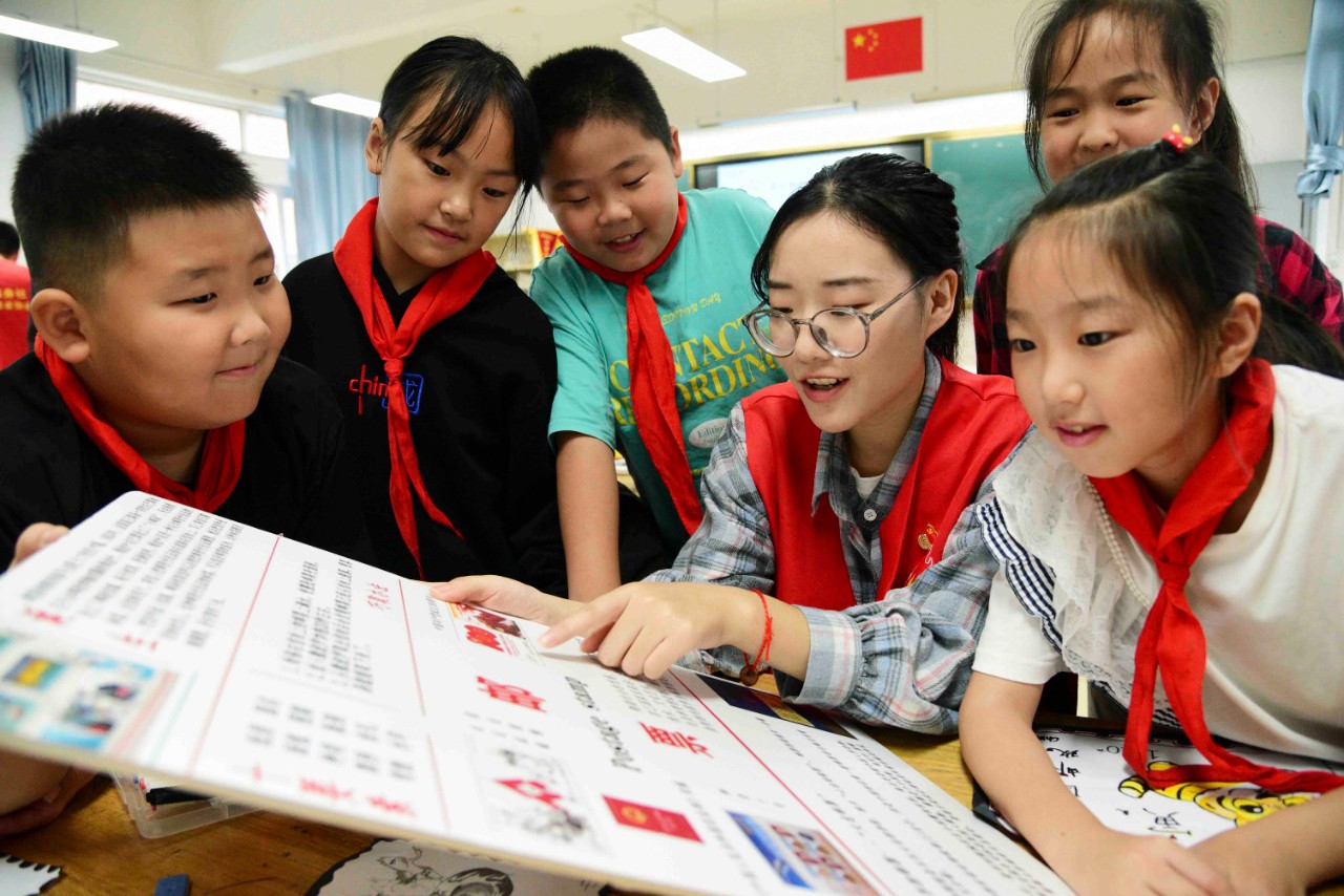 10月8日,在江苏省镇江市润商小学,雷竞技RAYBET最新版志愿者在为小学生讲解邮政知识。(石玉成 摄)