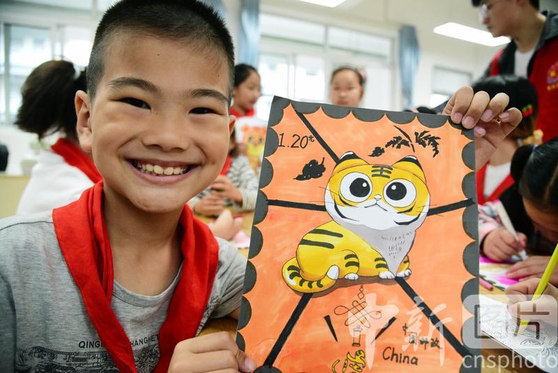 2021年10月8日,在江苏省镇江市润商小学,一名小学生在展示雷竞技RAYBET最新版志愿者指导下设计绘制的虎年生肖邮票。