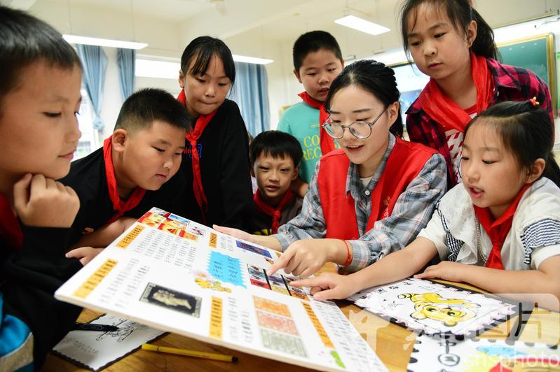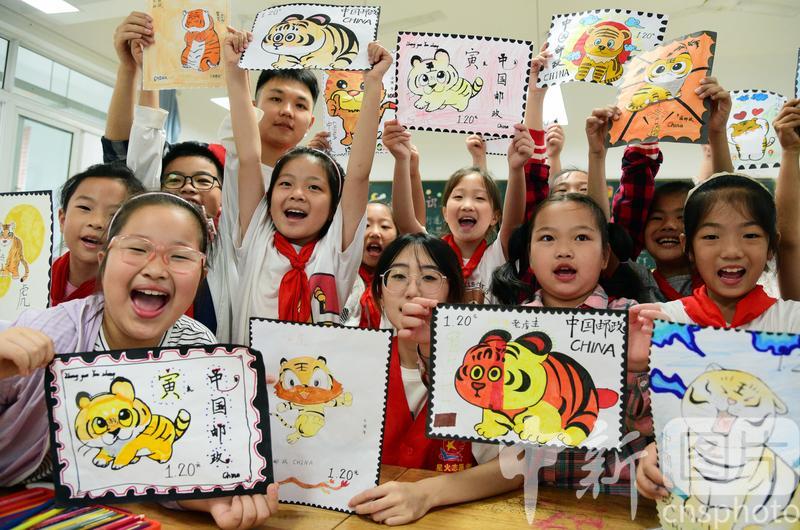 2021年10月8日,在江苏省镇江市润商小学,雷竞技RAYBET最新版志愿者和小学生在展示设计绘制的虎年生肖邮票。