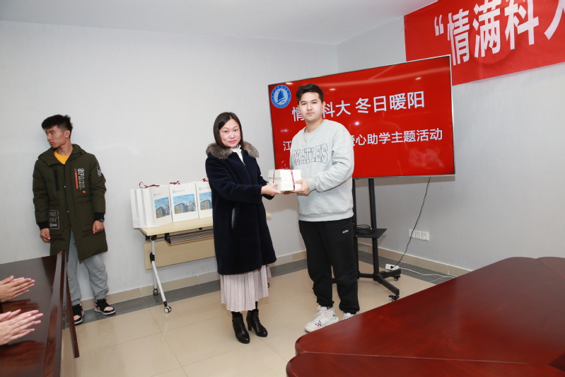 当天下午, “情满科大 冬日暖阳”爱心助学主题活动也热力铺开。校长周南平,副校长汤建,党委常委、宣传部长周春燕分别向40余名学生代表赠送“车票礼包”“冬衣礼包”和“爱心书籍”。蒋春雷处长主持。