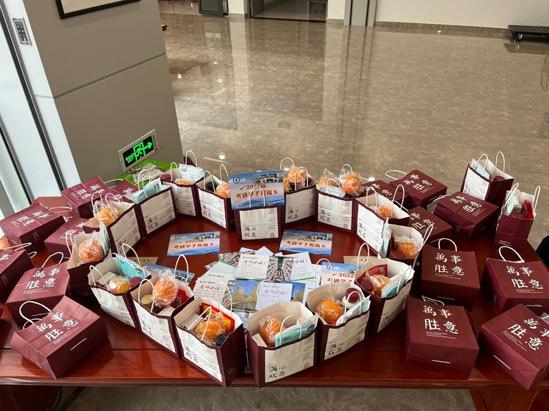 现场氛围其乐融融。学生处处长蒋春雷主持活动。大家为考研学子分发“考研福袋”,其中包含寓意“牛”气满满的牛奶、“啡”要上岸的咖啡、“橙”心如意的橙子、属你最“棒”的棒棒糖、“暖”意洋洋的暖宝宝、“罩”气蓬勃的口罩,以及全校师生代表为2021年考研学子手写的祝福卡片。一份份贴心礼物如冬日暖阳温暖考研学子心田,为他们考试冲锋助力护航,期盼他们一战成“硕”。