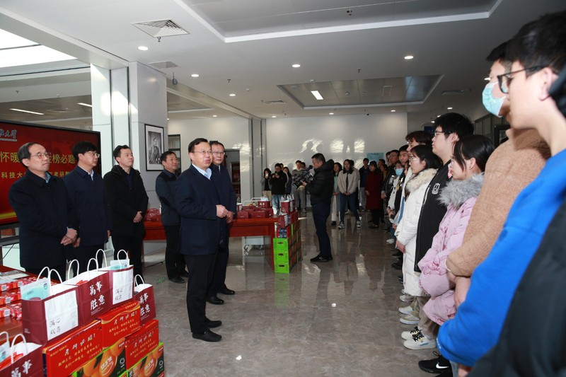 在学校图书馆考研自习室,周南平、汤建,校长办公室、学生处、研工部、团委、图书馆等职能部门负责人,共同走进考研自习室慰问备考学子,为考生加油鼓劲并送上温暖礼包。周南平与考生代表共同许愿,切分蛋糕,祝福考研学子“以梦为马,不负韶华,成功上岸,一研为定”。
