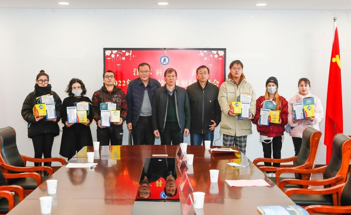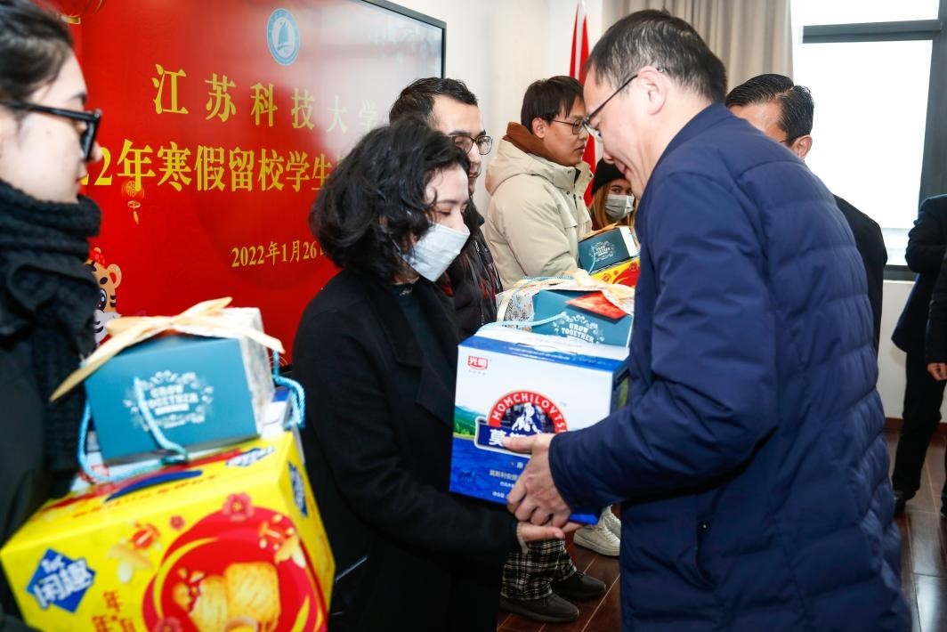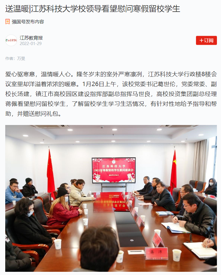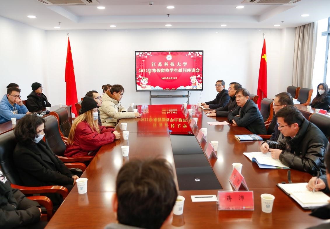 爱心驱寒意,温情暖人心。隆冬岁末的室外严寒凛冽,雷竞技RAYBET最新版行政楼8楼会议室里却洋溢着浓浓的暖意。1月26日上午,该校党委书记葛世伦,党委常委、副校长汤建,镇江市高校园区建设指挥部副总指挥马士良,高校投资集团副总经理蒋沛看望慰问留校学生,了解留校学生学习生活情况,有针对性地给予指导和帮助,并赠送慰问礼包。