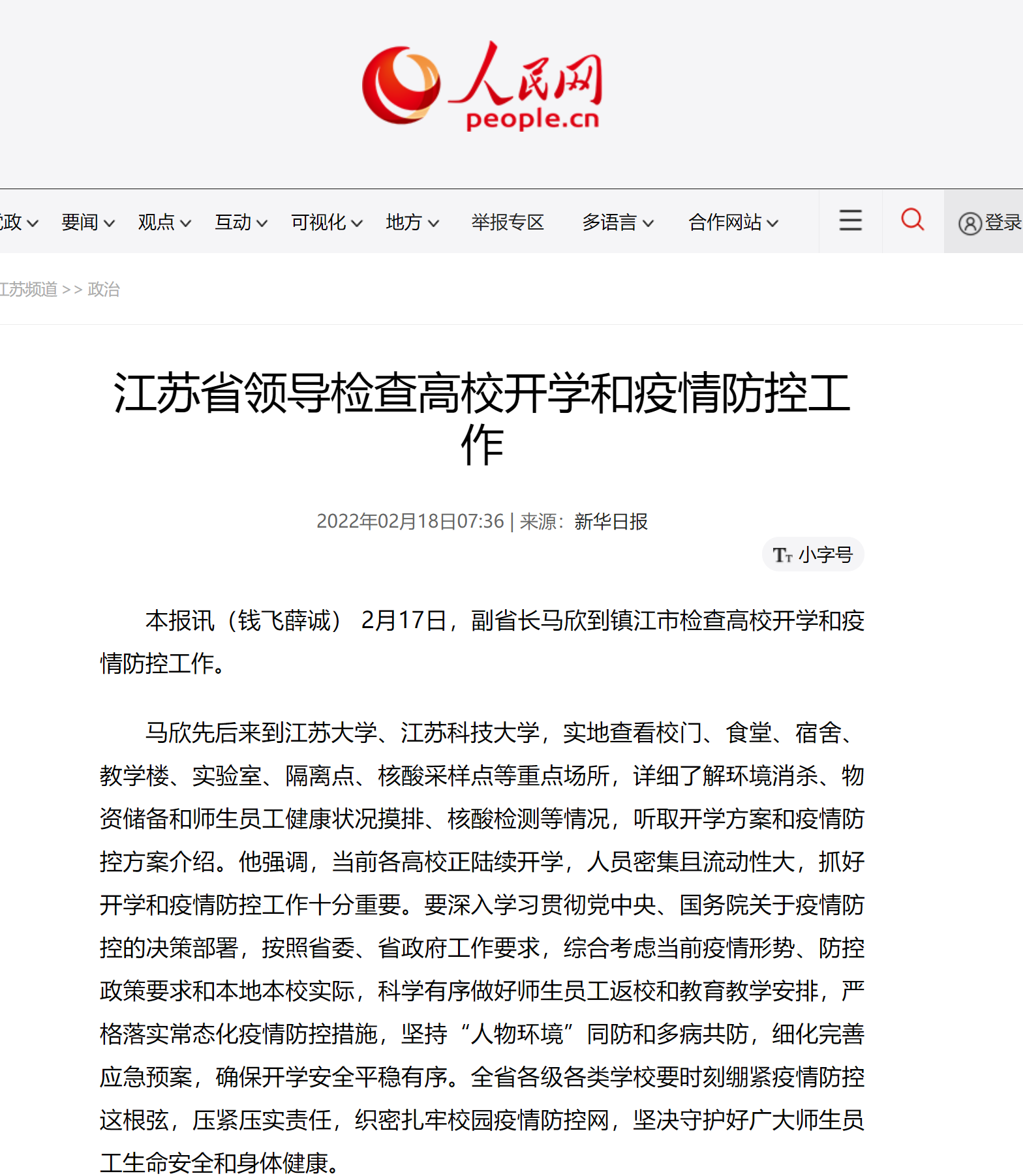 本报讯(钱飞薛诚) 2月17日,副省长马欣到镇江市检查高校开学和疫情防控工作。