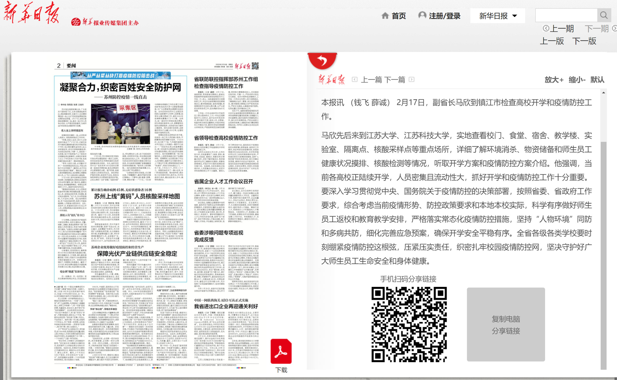 本报讯 (钱飞 薛诚) 2月17日,副省长马欣到镇江市检查高校开学和疫情防控工作。