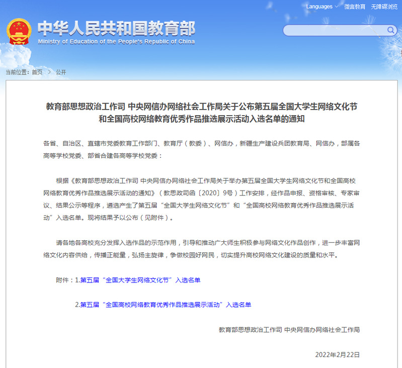 近日,中华人民共和国教育部下发了《教育部思想政治工作司、中央网信办网络社会工作局关于公布第五届全国大学生网络文化节和全国高校网络教育优秀作品推选展示活动入选名单的通知》。在校党委宣传部领导组织下,RAYBET官网马克思主义学院提交的网络作品《青藏铁路精神》获得优秀奖。
