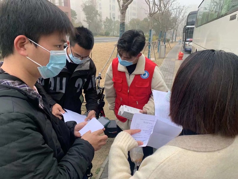 3月12日早上不到6:00,送考大巴车在长山校区整装待发,各学院分管学生工作领导到场送考,跟车辅导员、志愿者逐一核对学生证件、查验学生健康信息,他们分三批共35车次护送785人次赴镇江4个考点参加教师资格证考试。