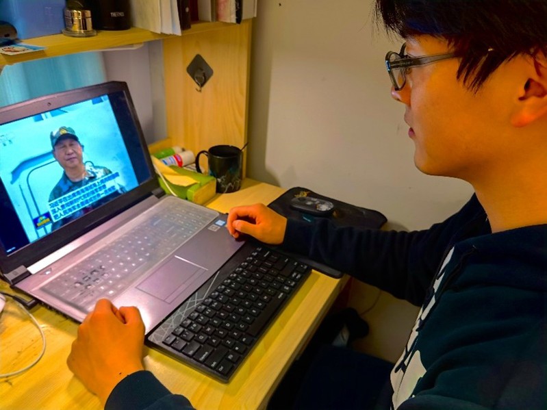 海洋学院组织青年学生重温中央军委2018年4月12日在南海海域海上阅兵视频,学习习近平总书记在检阅部队时的重要讲话精神,激发强国强军坚定信念。视频中的海上编队精彩亮相,视频外的海洋学子全神贯注。阅兵式中,水下潜艇穿梭似箭,海面战舰驰骋破风,空中战机翱翔九霄。可谓蓝天之上,风云变幻;深海之下,气势磅礴。这一幕幕挺进深蓝的壮美航迹,似一幅幅气势磅礴的画卷在海洋学子的心中铺展开来,牵引着他们的心神,激励着他们坚定蓝色信念,引导他们向着海洋梦、强国梦的目标不断奋进。