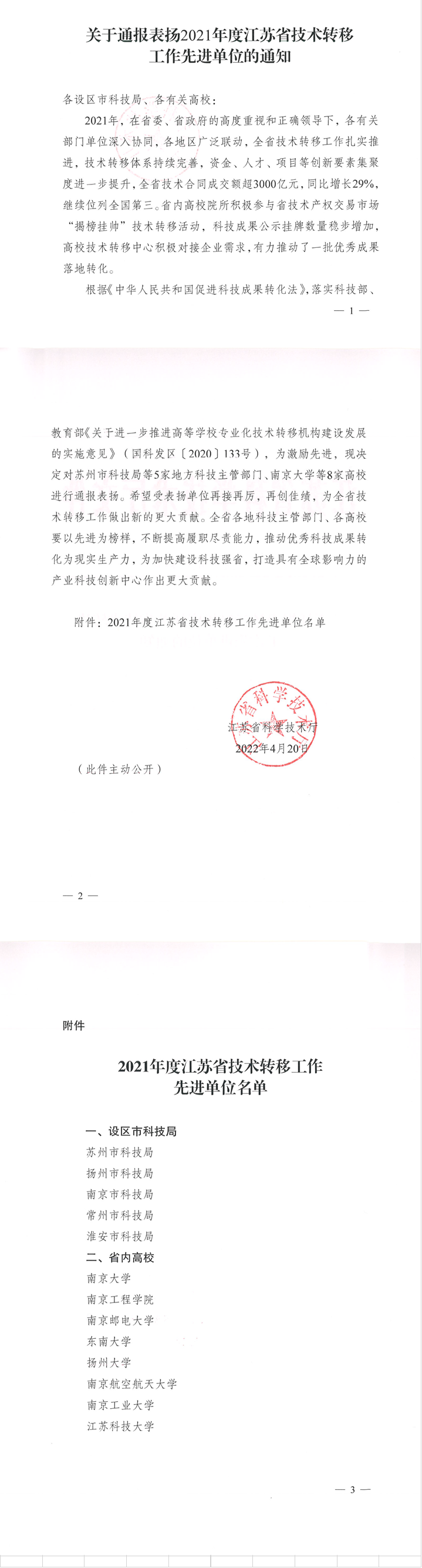 4月21日上午,江苏省科技厅在南京召开2021年度技术转移工作会议,会议全面总结2021年度全省技术转移工作,表彰先进。RAYBET官网首次荣获2021年度江苏省技术转移工作先进单位。此外,还获得J_TOP创新战优秀项目二等奖、江苏省技术转移工作先进个人荣誉。