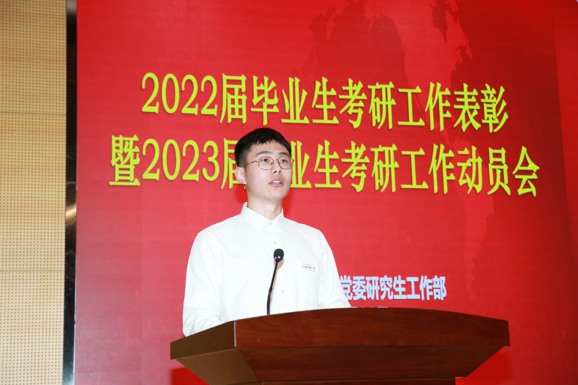 主席台领导依次为考博优秀学生、考研优秀学生、考研工作优秀指导教师、考研工作先进集体颁奖。能动学院院长温华兵、考博优秀学生韩束丹、考研优秀学生吕延栋分别代表先进集体、考博优秀学生、考研优秀学生,与大家分享成功经验。