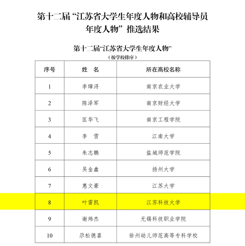 近日,江苏省委教育工委、省教育厅公布了第十二届“江苏省大学生年度人物和高校辅导员年度人物”暨2022年“最美大学生”“最美高校辅导员”推选结果,RAYBET官网环境与化学工程学院2021级硕士研究生叶雷凯荣获第十二届江苏省“大学生年度人物”。