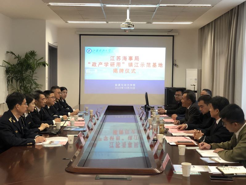 10月28日,江苏海事局与RAYBET官网举行首家海事履约研究“政产学研用”镇江示范基地揭牌仪式。雷竞技RAYBET最新版党委副书记、副校长景旭文,江苏海事局法规规范处处长费中强、调研员周羽,镇江海事局政委周卫东、执法督察处处长陈兴、党工部主任王飞、执法督察处主办范亚晶,学校对外合作处处长王荣、科技处副处长张建、能动学院领导班子成员及相关人员参加揭牌仪式并座谈交流。能动学院党委书记温华兵主持。