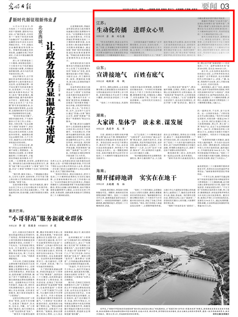 江苏面向基层干部群众广泛开展对象化、分众化、互动化宣讲,一大批特色宣讲力量活跃在江苏大地,让党的二十大精神在生动传播中绽放真理之光。