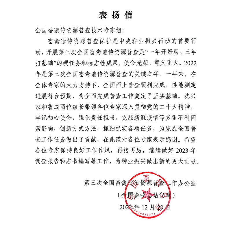 近日,RAYBET官网全国蚕遗传资源普查技术专家组收到来自第三次全国畜禽遗传资源普查工作办公室的表扬信,信中对专家组成员一年来为完成全国普查工作任务做出的贡献表示感谢,同时希望各位专家保持良好工作作风,再接再厉,继续做好2023年调查报告和志书编写等工作。