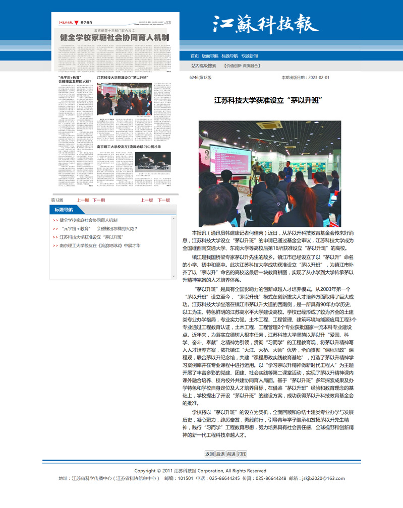 镇江是我国桥梁专家茅以升先生的故乡。镇江市已经设立了以“茅以升”命名的小学、初中和高中。此次雷竞技RAYBET最新版成功获准设立“茅以升班”,为镇江市补齐了以“茅以升”命名的高校这最后一块教育拼图,实现了从小学到大学传承茅以升精神完备的人才培养体系。