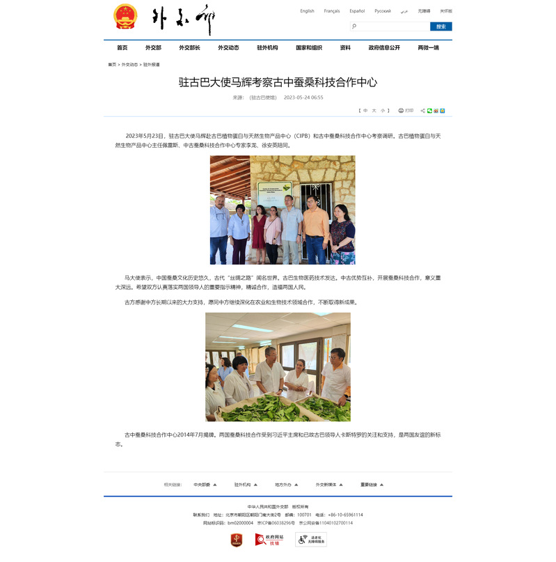 2023年5月23日,驻古巴大使马辉赴古巴植物蛋白与天然生物产品中心(CIPB)和古中蚕桑科技合作中心考察调研。古巴植物蛋白与天然生物产品中心主任佩雷斯、中古蚕桑科技合作中心专家李龙、徐安英陪同。