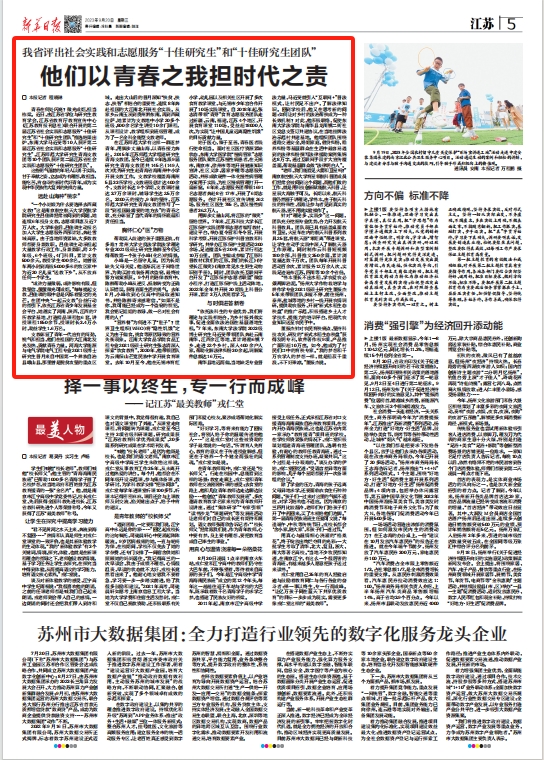 青春在何处闪亮?微光成炬,担当栋梁。近日,由江苏省学位与研究生教育学会、江苏省教育厅教育宣传中心(江苏教育报刊总社)联合开展的第二届江苏省社会实践和志愿服务“十佳研究生”和“十佳研究生团队”推选结果出炉,东南大学马近斐等 10 人获评第二届江苏省社会实践和志愿服务“十佳研究生”,江苏师范大学研究生青海支教团等10个团队获评第二届江苏省社会实践和志愿服务“十佳研究生团队”。这些朝气蓬勃的年轻人以勇于实践、甘于奉献之姿,立志成为有理想、敢担当、能吃苦、肯奋斗的新时代好青年,成为实现中华民族伟大复兴的先锋力量。