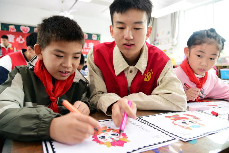 图为志愿者与小朋友一起绘制邮票 石玉成 摄
