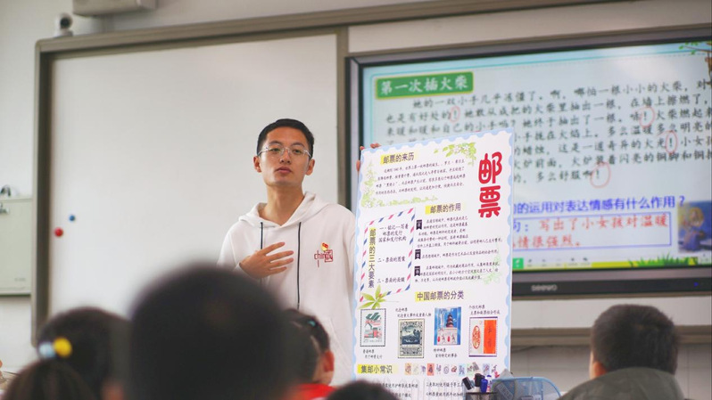 青年志愿者带着小朋友们欣赏六枚鲜艳的邮票,领略一位英雄风采。他是中国人民解放军,是中共党员,更是人民的好儿子——刘英俊。“在1966年3月15日的清晨,和往常一样,刘英俊与战友外出训练,他驾的炮车辕马被汽车喇叭声所惊,突然向人群冲去,6个儿童的生命受到严重威胁。刘英俊在千钧一发之际双手猛拉缰绳,双脚猛跺马的后腿,将6名儿童安全救下,自己却压在翻倒的车马底下......”志愿者娓娓道来,小朋友们也听入了神,励志要读好中国故事,学习英雄本色,肩负起建设祖国的使命。