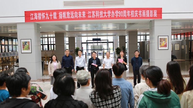 校党委常委、副校长周宏根致开幕词。他指出,值此学校九十周年华诞之际,承蒙师生、校友厚爱,或以丹青描绘依山傍湖的美丽校园,或用笔墨书写磅礴动人的船魂精神,纷纷惠寄精品之作,为办学90周年献礼。为此,学校特举办本次主题展,以此进一步彰显校园文化精神,激发广大师生爱校、荣校、兴校、强校之情。希望广大师生员工以此次书画摄影作品展为契机,进一步提升文化自觉和文化自信,不断增强价值认同和行动自觉,再接再厉,开拓创新,更好地运用自己手中的画笔或镜头,讴歌伟大的新时代,讴歌江科大的新发展,为学校文化事业大发展大繁荣做出新的更大的贡献。
