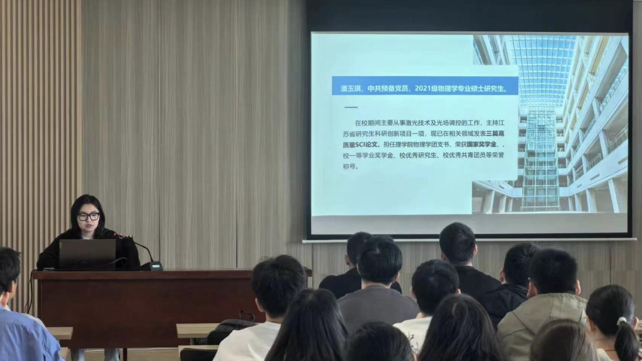 潘玉琪同学则围绕专业课学习、文献阅读、论文撰写、科研计划等方面进行了详细讲解。她表示同学们应多关注课题组相关领域的学术动态,明确自身课题研究目标,系统研学相关知识,养成独立思考的科研习惯。她建议同学们不仅要有研究生阶段的大规划,也得有每个学期的小规划,拒绝拖延,及时把握投稿的各个节点,不断提升,全面发展。