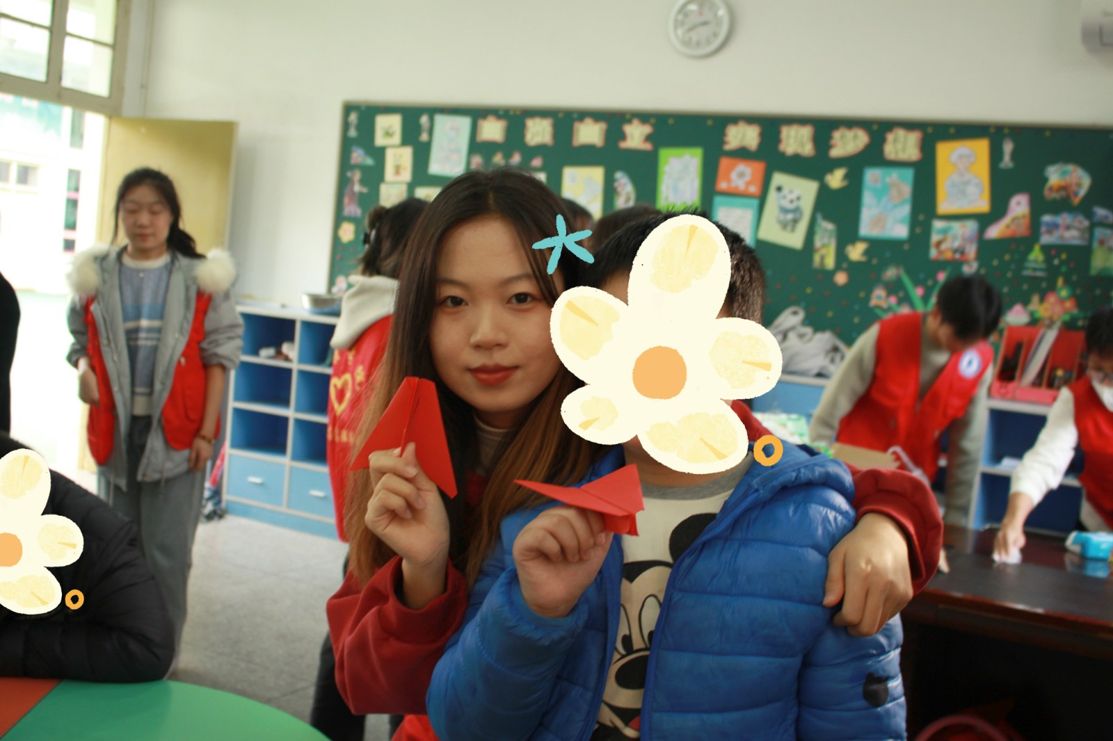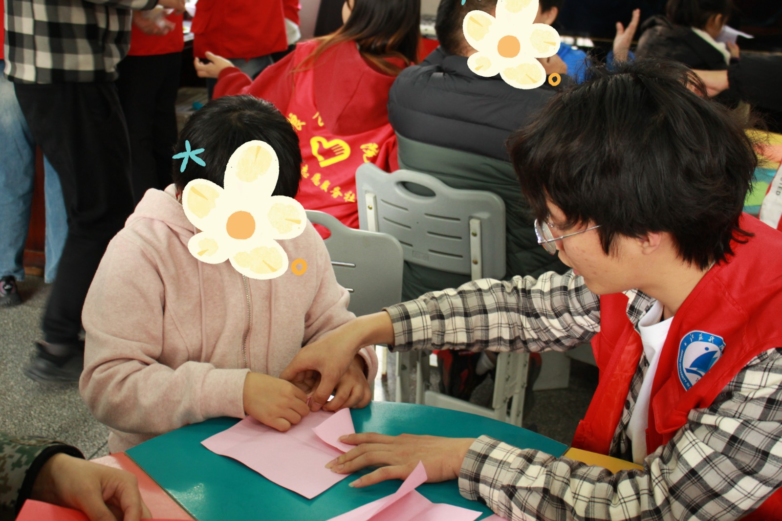 通过折纸可以帮助特殊儿童进行精细运动训练,有利于提高儿童手眼协调能力。志愿者一步步教小朋友折出纸飞机并掷向天空,承载着对特殊儿童的美好祝愿。
