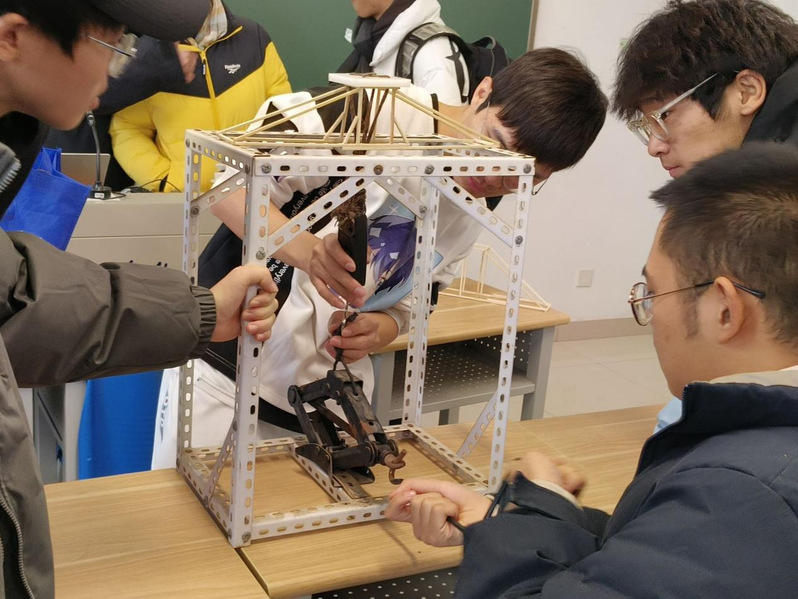 结构承重类决赛在长山校区明德楼204同期举行。十一支参赛队伍结合所学专业知识,使用统一发放的材料精心制作出各种承重结构,充分发挥了自身的动手能力和创新思维,展现了当代大学生敢于思考、勇于实践的能力。比赛现场,工作人员依次对每队作品进行了称重、承重测试,最后由大赛组委会进行计算承重比,根据极限承重的大小确定获奖队伍,最终“哦吼吼队”等八支队伍获奖。