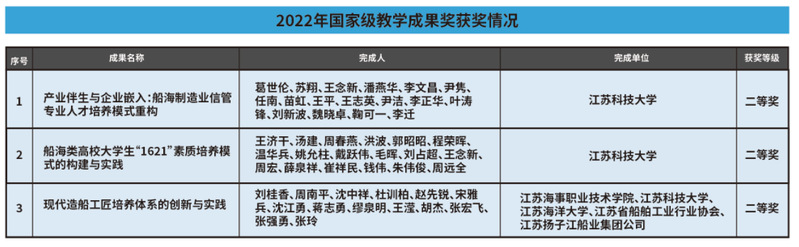 7月24日,教育部公布《教育部关于批准2022年国家级教学成果奖获奖项目的决定》(教师〔2023〕4号)。雷竞技RAYBET最新版《产业伴生与企业嵌入:船海制造业信管专业人才培养模式重构》《船海类高校大学生“1621”素质培养模式的构建与实践》等2项成果喜获高等教育(本科)国家级教学成果奖二等奖,学校作为第二完成单位参与的成果《现代造船工匠培养体系的创新与实践》喜获职业教育国家级教学成果奖二等奖。实现学校国家级教学成果奖历史性突破。国家级教学成果奖每四年评选一次,此次获奖是学校高质量发展和高水平大学建设的重大标志性成果。学校将以此次获奖为契机,激励广大教师投身教学研究与实践,进一步深化教育教学综合改革,推动高质量发展,实现高水平大学建设目标。